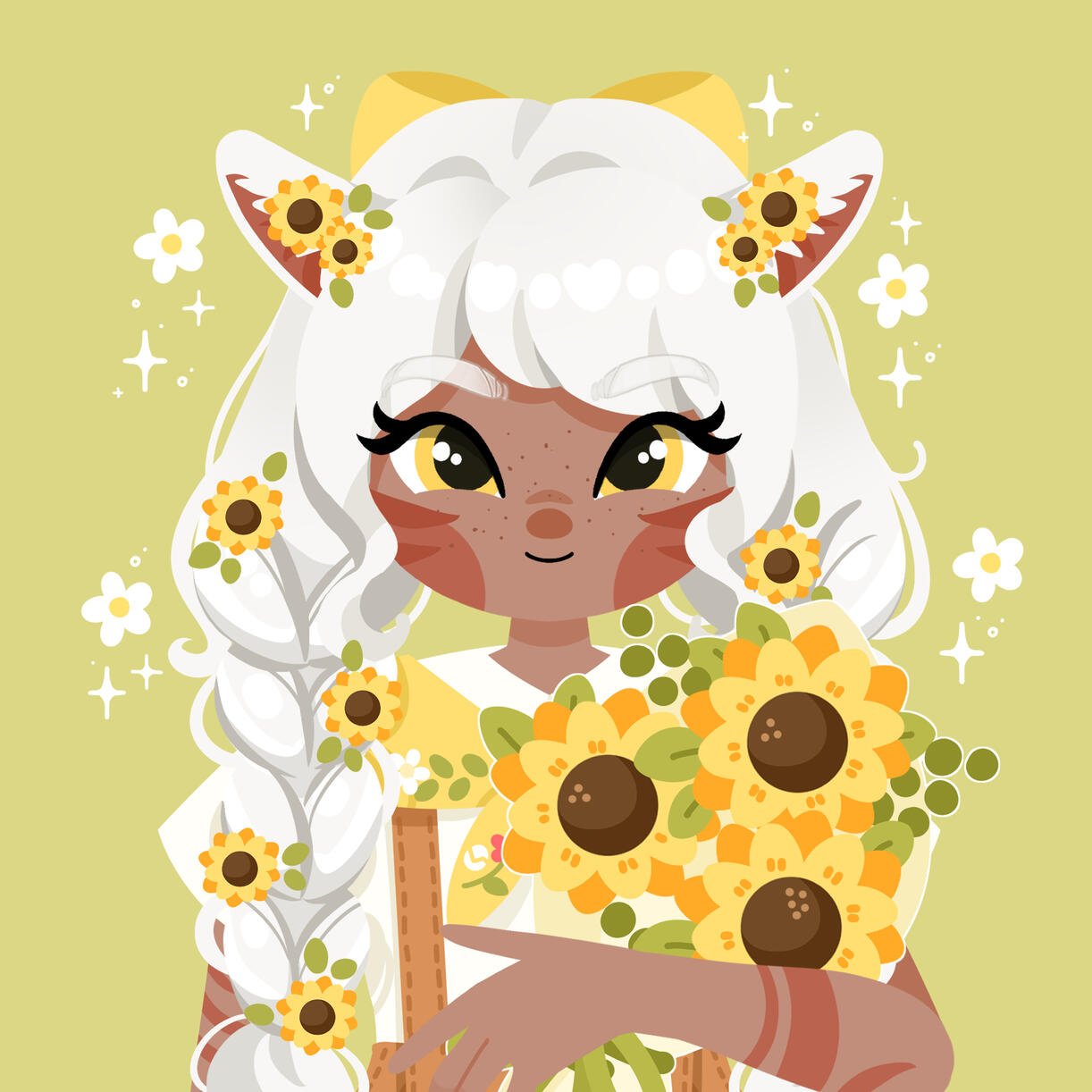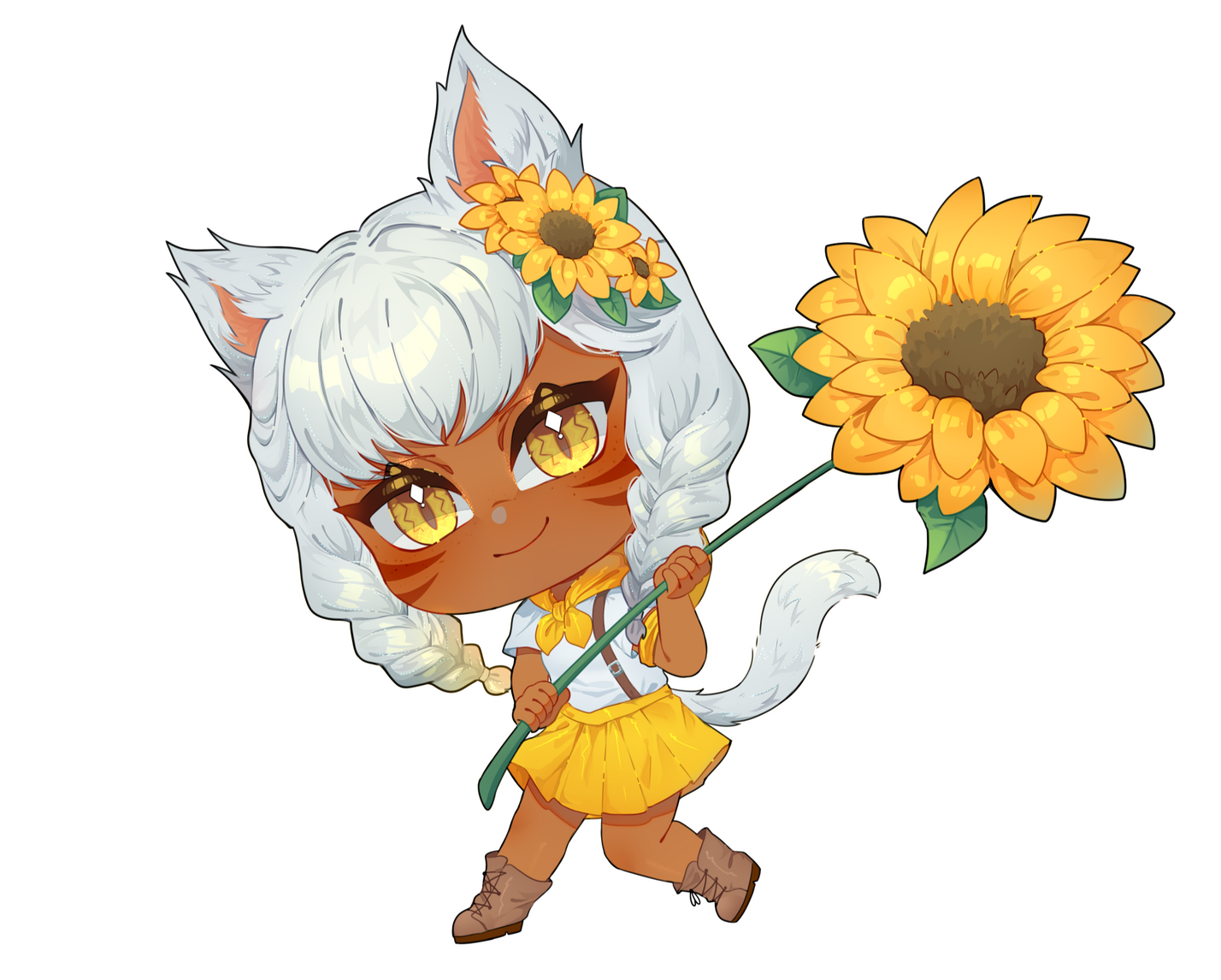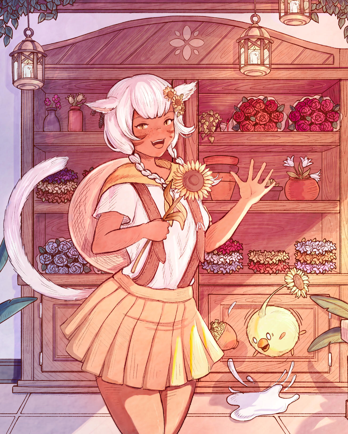 Sol is pure sunshine in miqo'te form— radiant, cheerful, and brimming with warmth! She's a florist and runs the flower shop called The Sunny Korpokkur. She can be found handing out flowers and floral accessories in Eorzea, spreading sunny vibes where ever she goes~